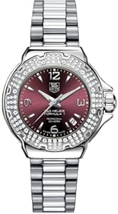 Glitzy and glamorous, this TAG Heuer timepiece boasts both beauty and an impeccable design. Its stainless-steel band features an eye-pleasing stripe of polished stainless-steel and joins to a 38-millimeter-in-diameter stainless-steel case topped by an elegantly polished stainless-steel bezel studded with diamonds. The scratch-resistant sapphire-coated window reveals a metallic burgundy dial that showcases a sophisticated mix of silver-tone Arabic numeral and shape hour indicators as well as small silver-tone stick minute markers. Luminescent hour hands and a discreet date window at the four o'clock add convenience to this fine, durable timepiece that's water resistant to an impressive 660 feet.