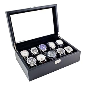 Read the full review. Carbon Fiber Pattern Glass Top Watch Case Display Storage Watch Box Holds 10 Watches With Removable Pillows And High Clearance For Large Watches